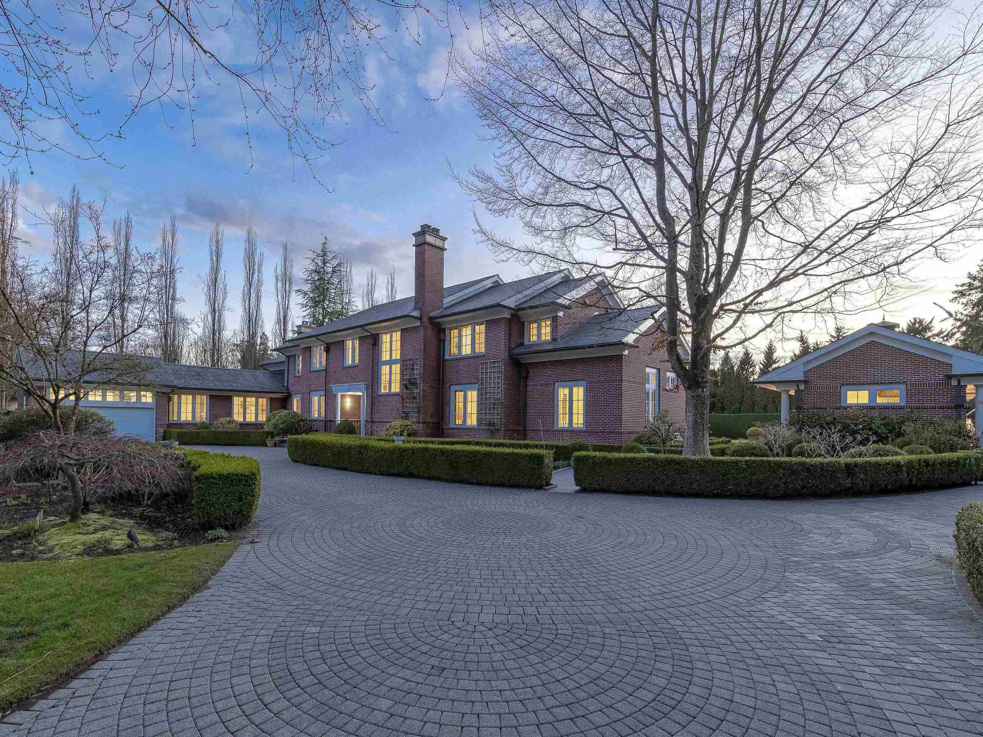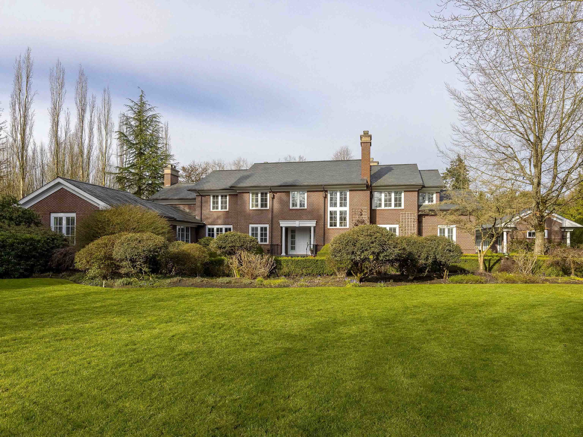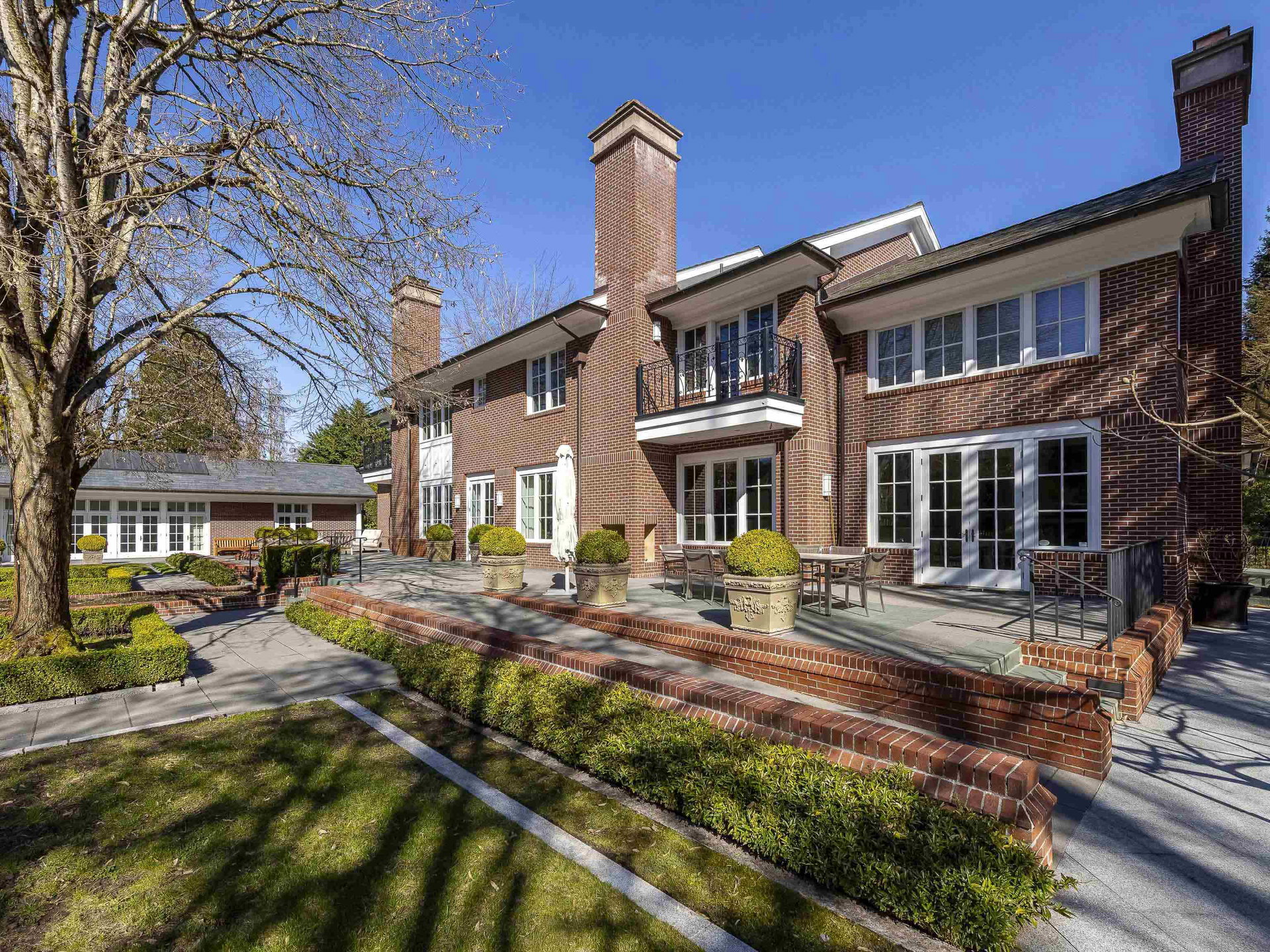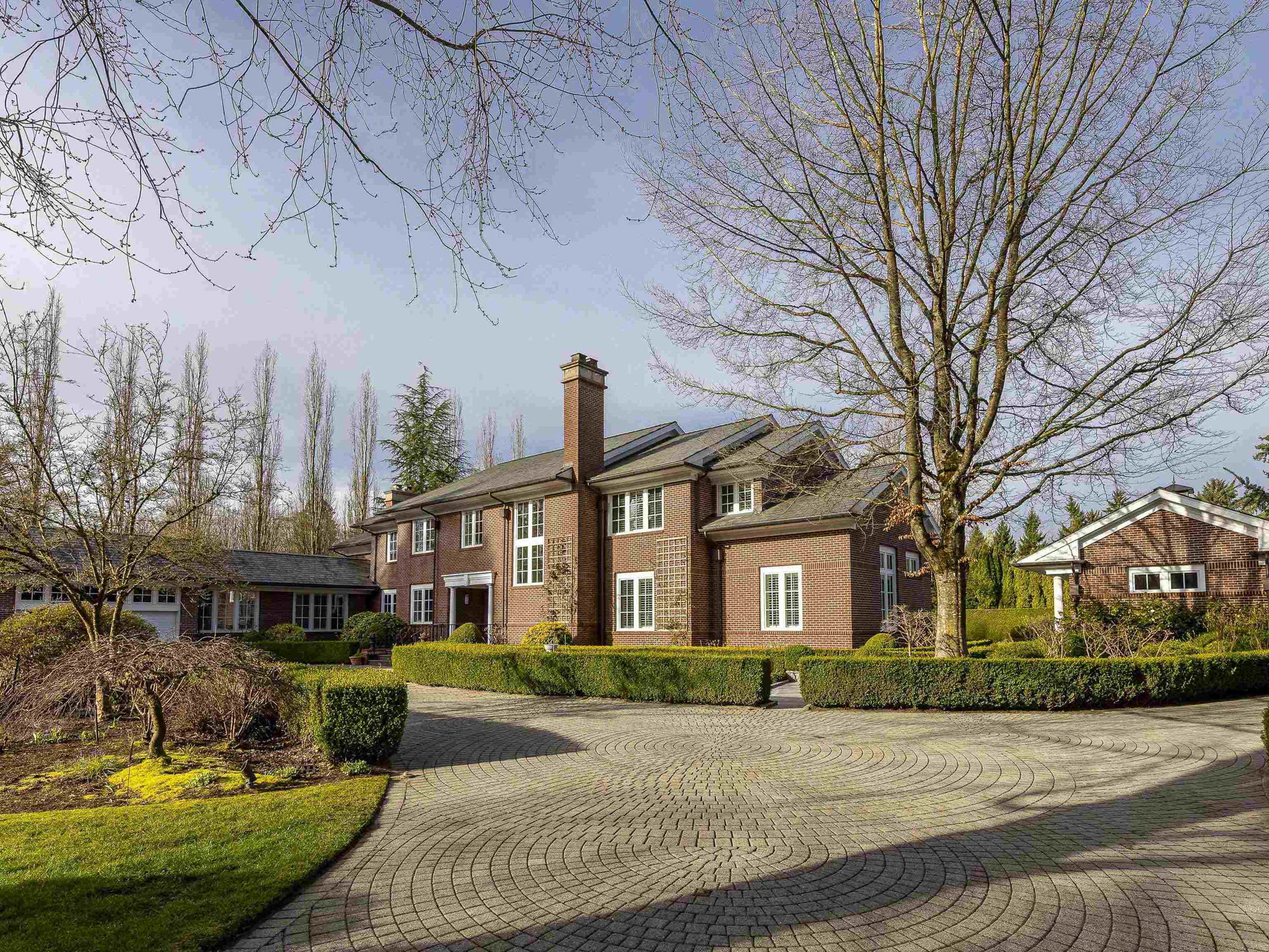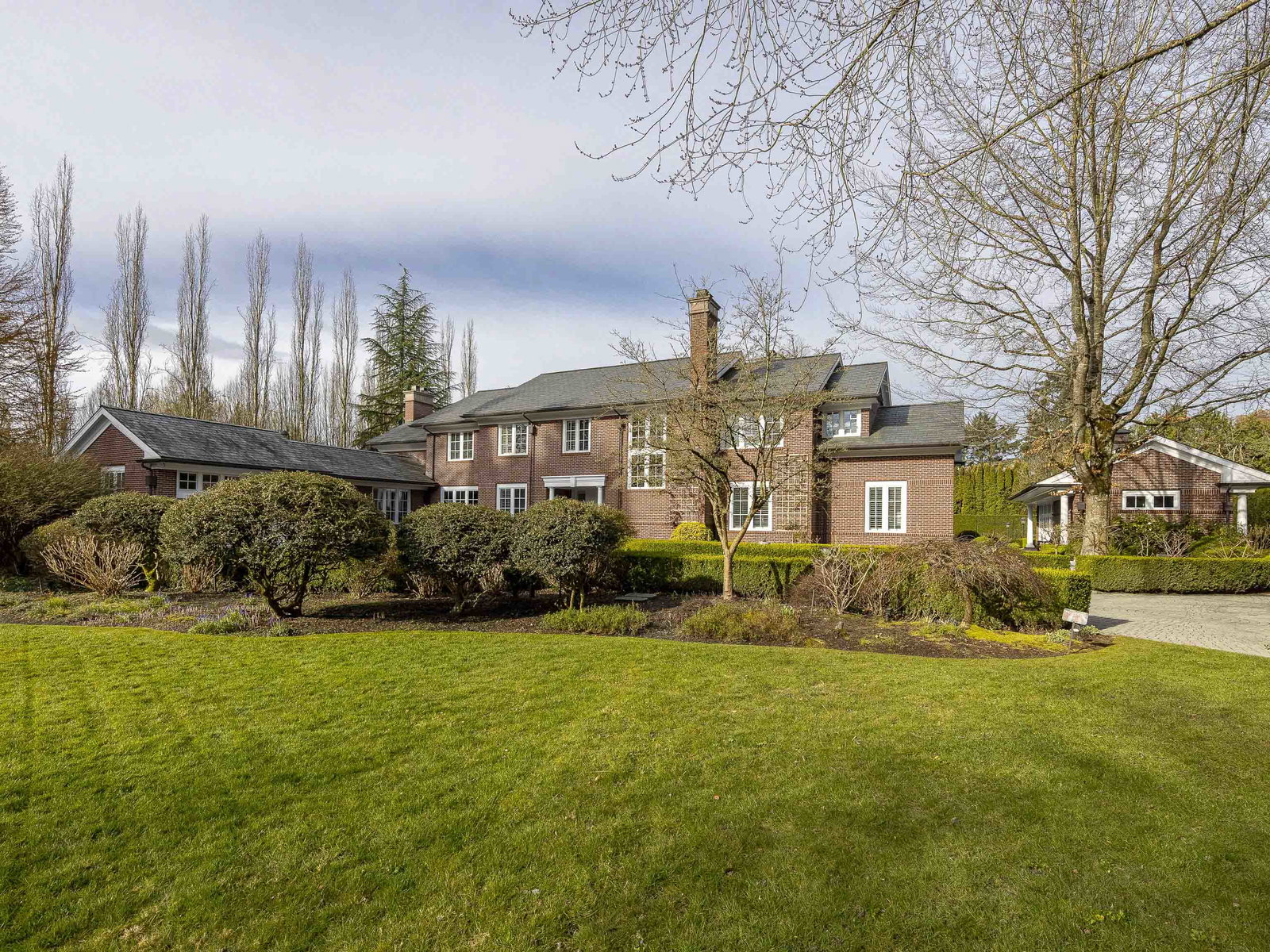 Stunning Southlands estate set on a rare 59,060 sqft lot, this sprawling English manor–inspired residence blends timeless elegance with refined living. The stately red brick home spans 5,638 sqft, featuring beautiful marble and hardwood floors, clean lines, and expansive floor-to-ceiling windows that flood the home with natural light. Grand principal rooms include a formal living and dining room, library, office, family room, and gourmet kitchen designed for both entertaining and everyday living. Upstairs offers a luxurious primary suite with walk-in closet & ensuite, reading area, and additional bedrooms and baths. A separate coach house of 773 sqft. adds flexibility. Surrounded by lush, landscaped gardens, this exceptional property evokes the charm and grace of a classic European manor.