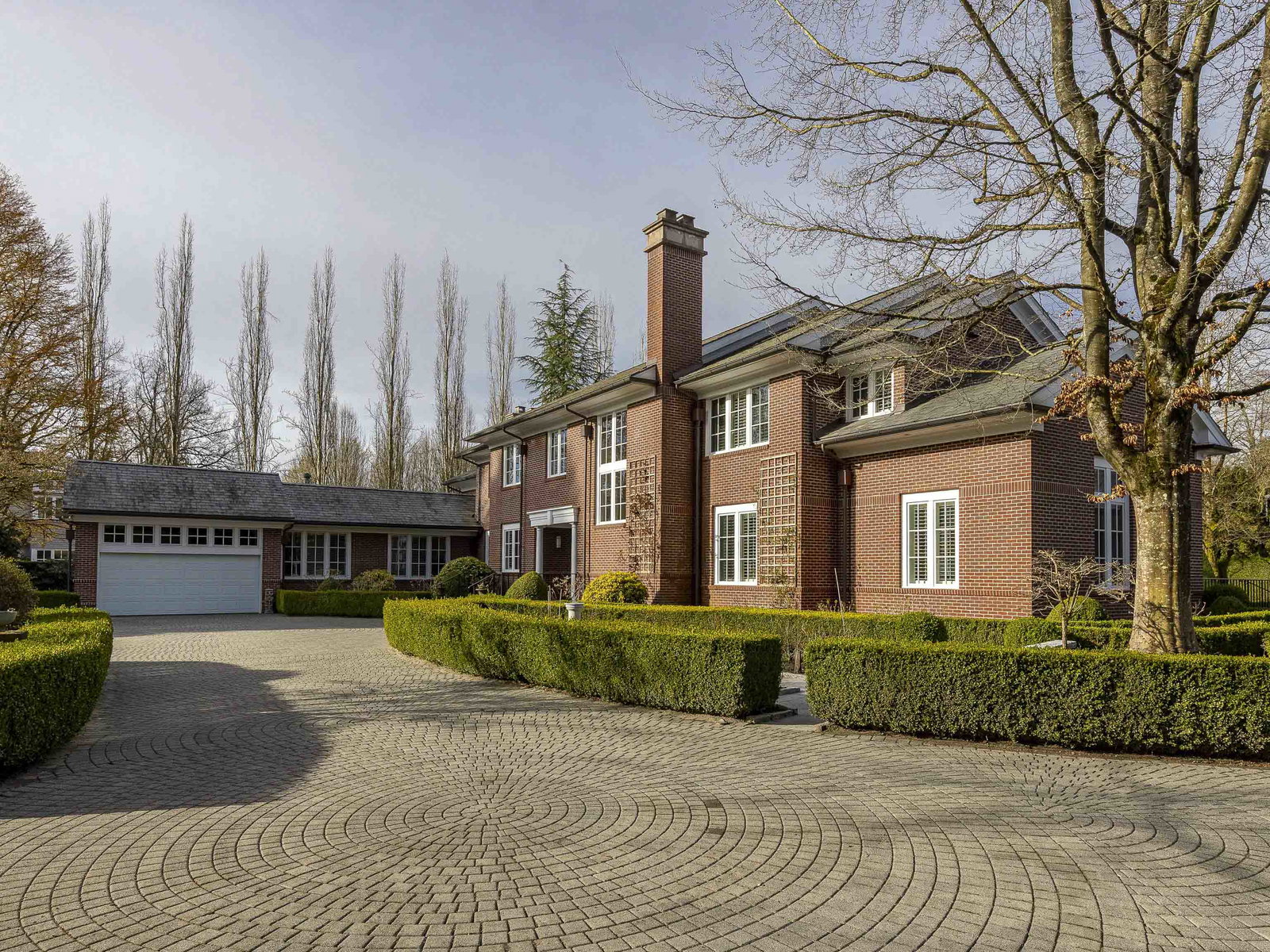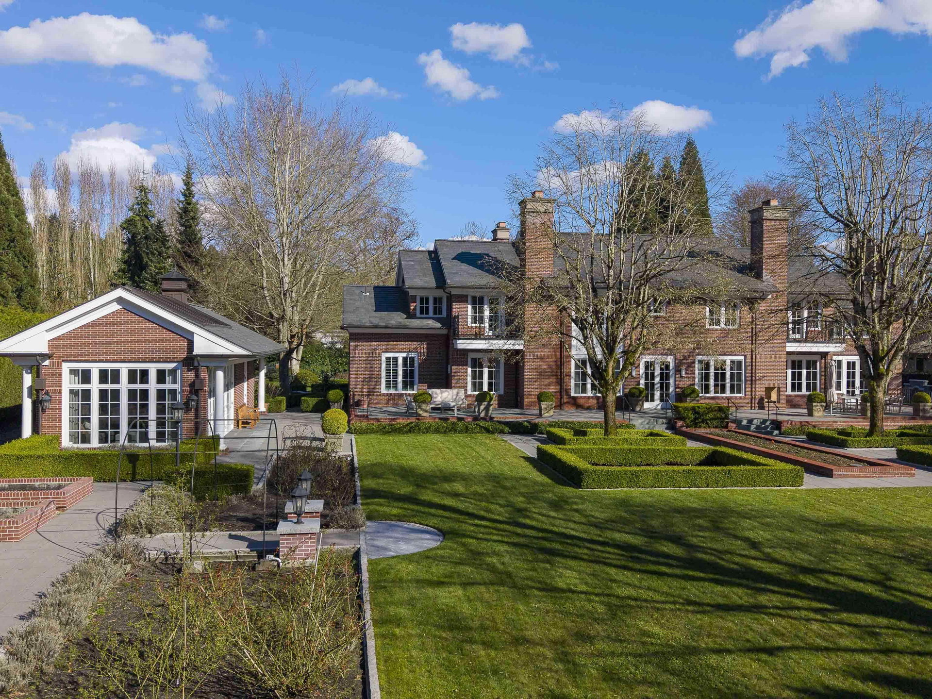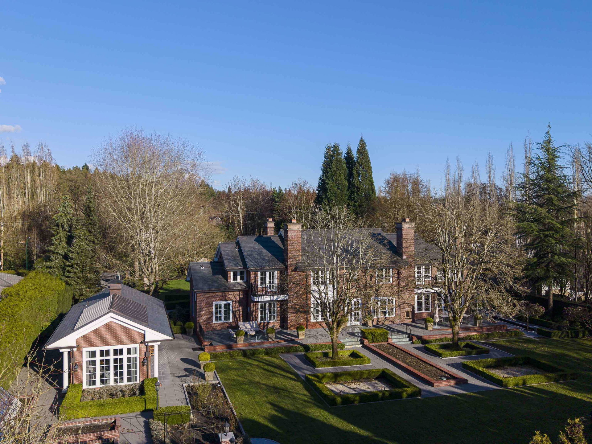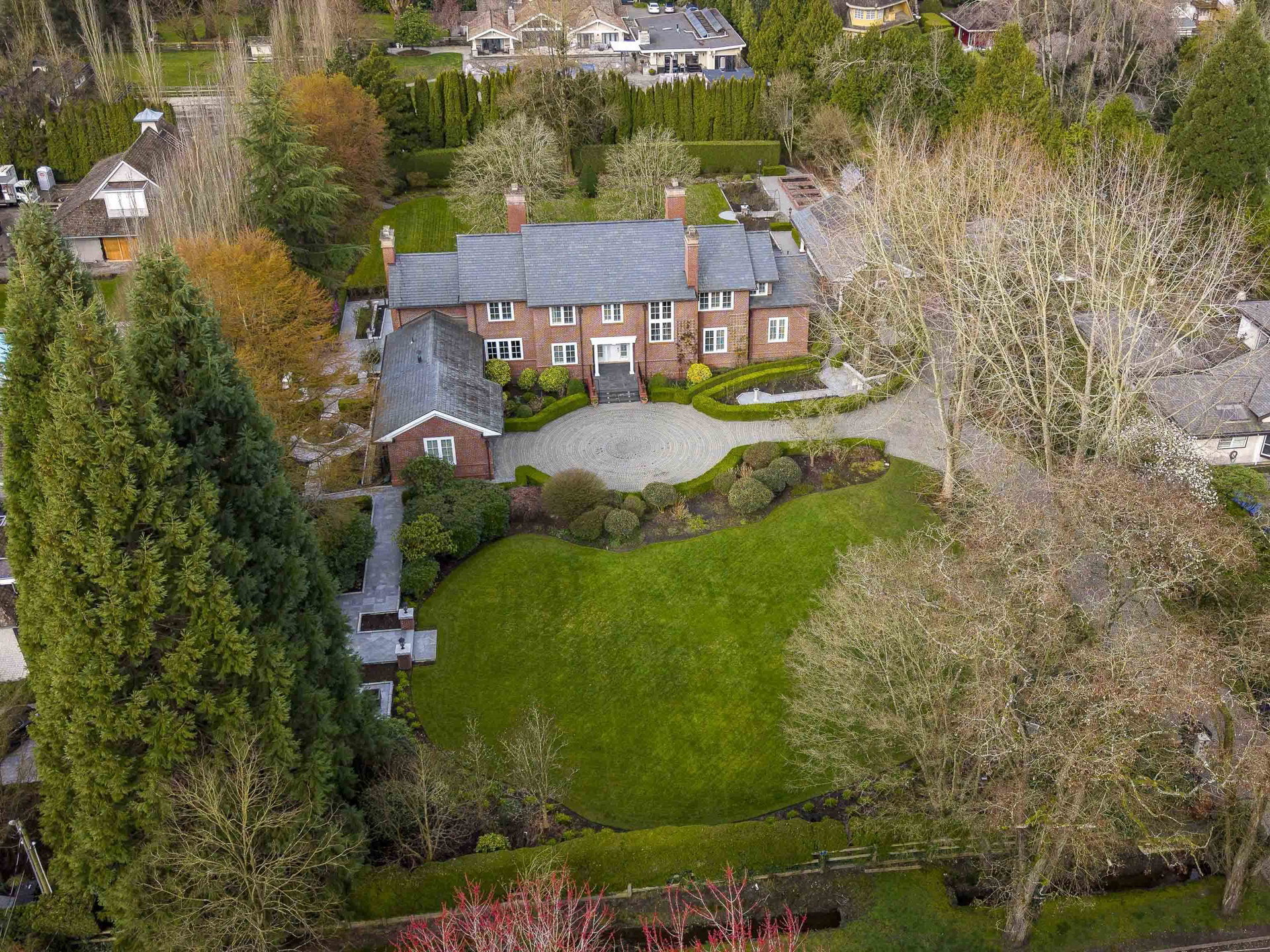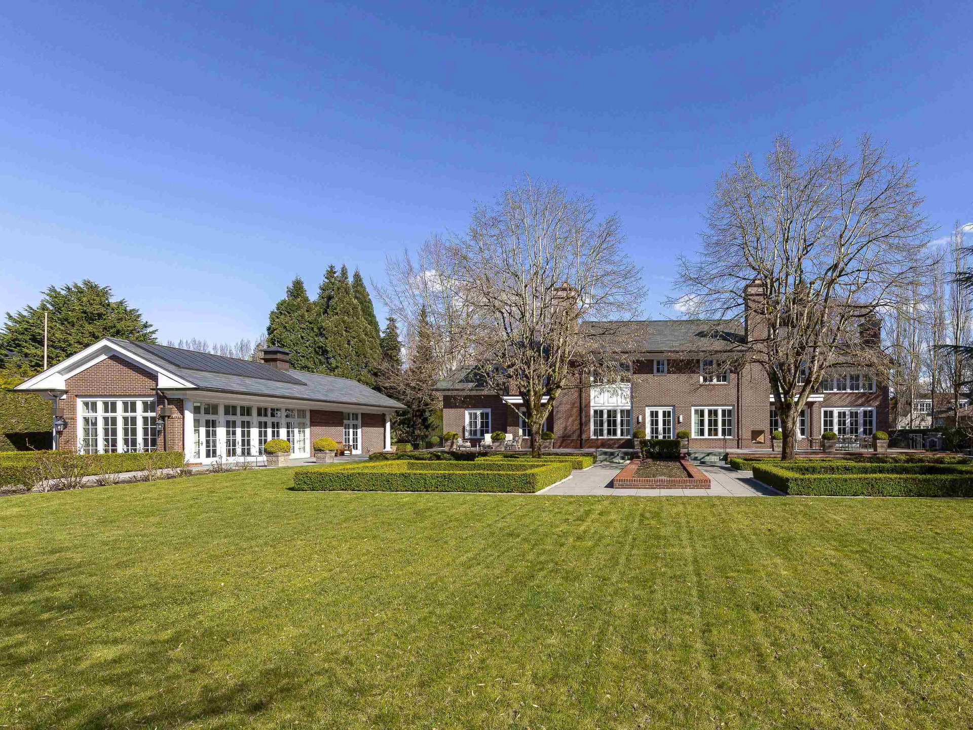 Stunning Southlands estate set on a rare 59,060 sqft lot, this sprawling English manor–inspired residence blends timeless elegance with refined living. The stately red brick home spans 5,638 sqft, featuring beautiful marble and hardwood floors, clean lines, and expansive floor-to-ceiling windows that flood the home with natural light. Grand principal rooms include a formal living and dining room, library, office, family room, and gourmet kitchen designed for both entertaining and everyday living. Upstairs offers a luxurious primary suite with walk-in closet & ensuite, reading area, and additional bedrooms and baths. A separate coach house of 773 sqft. adds flexibility. Surrounded by lush, landscaped gardens, this exceptional property evokes the charm and grace of a classic European manor.