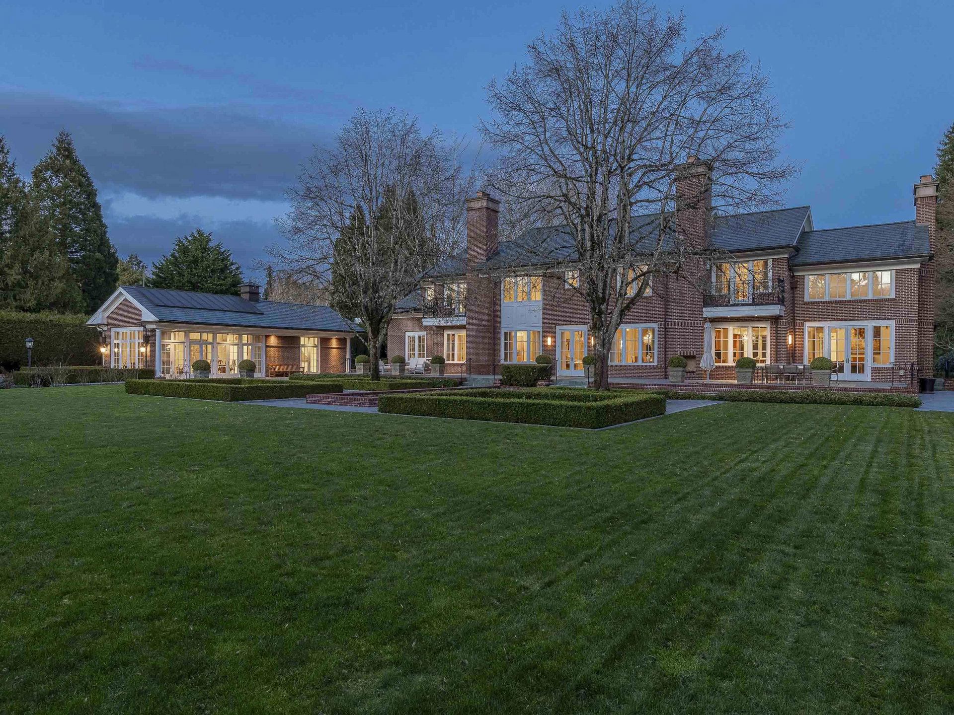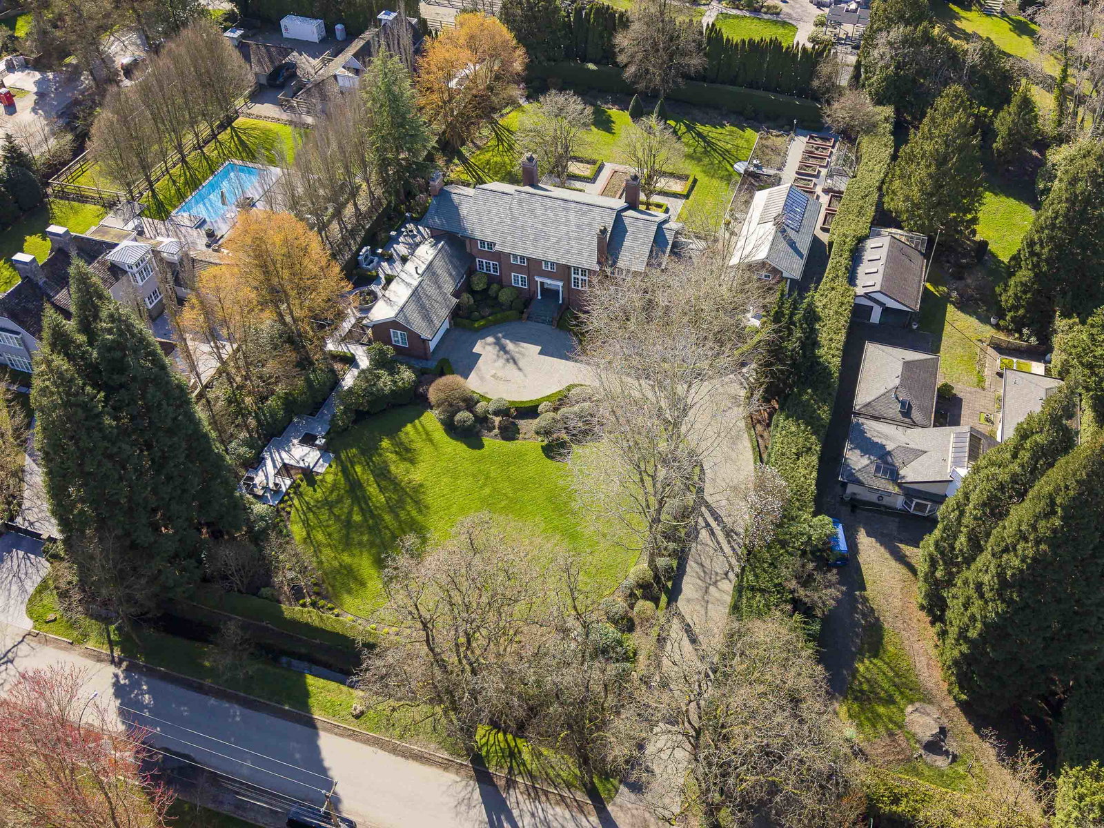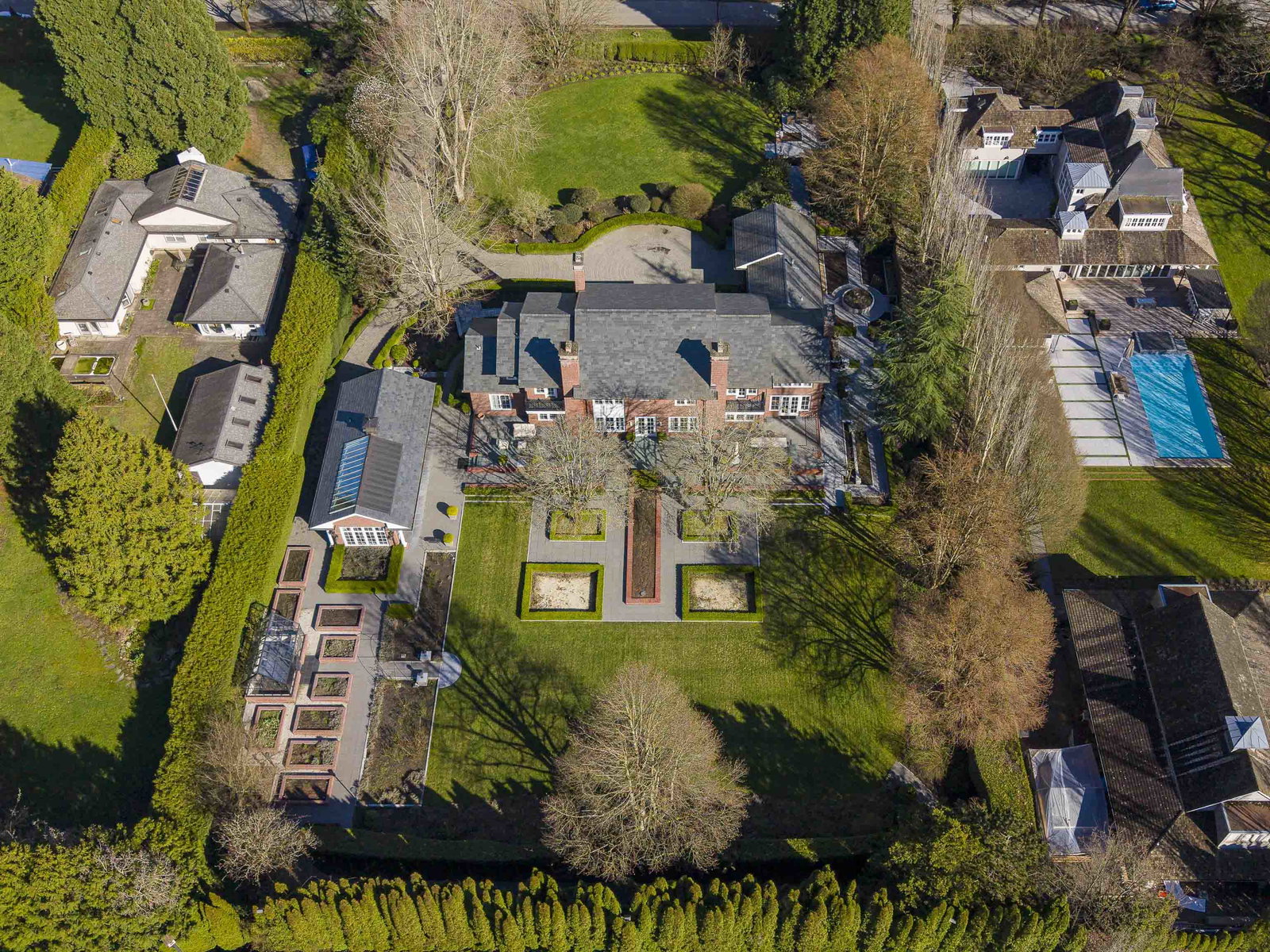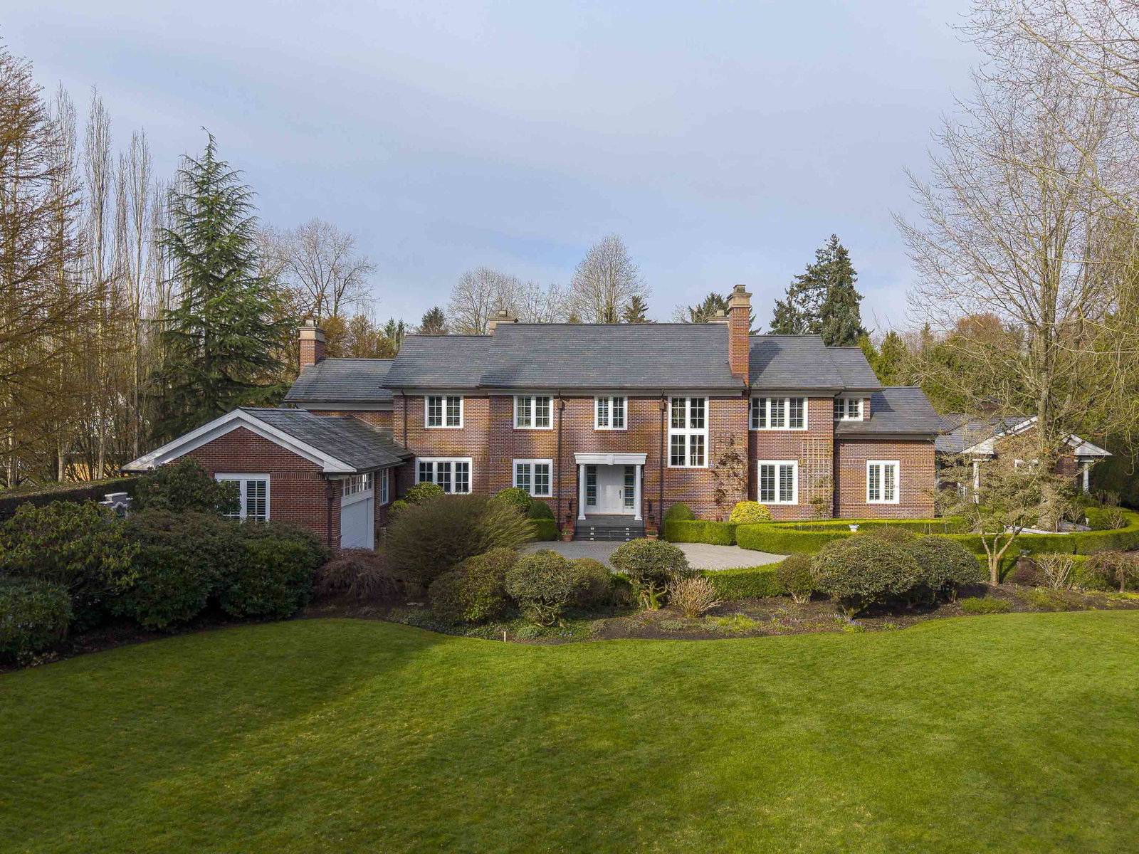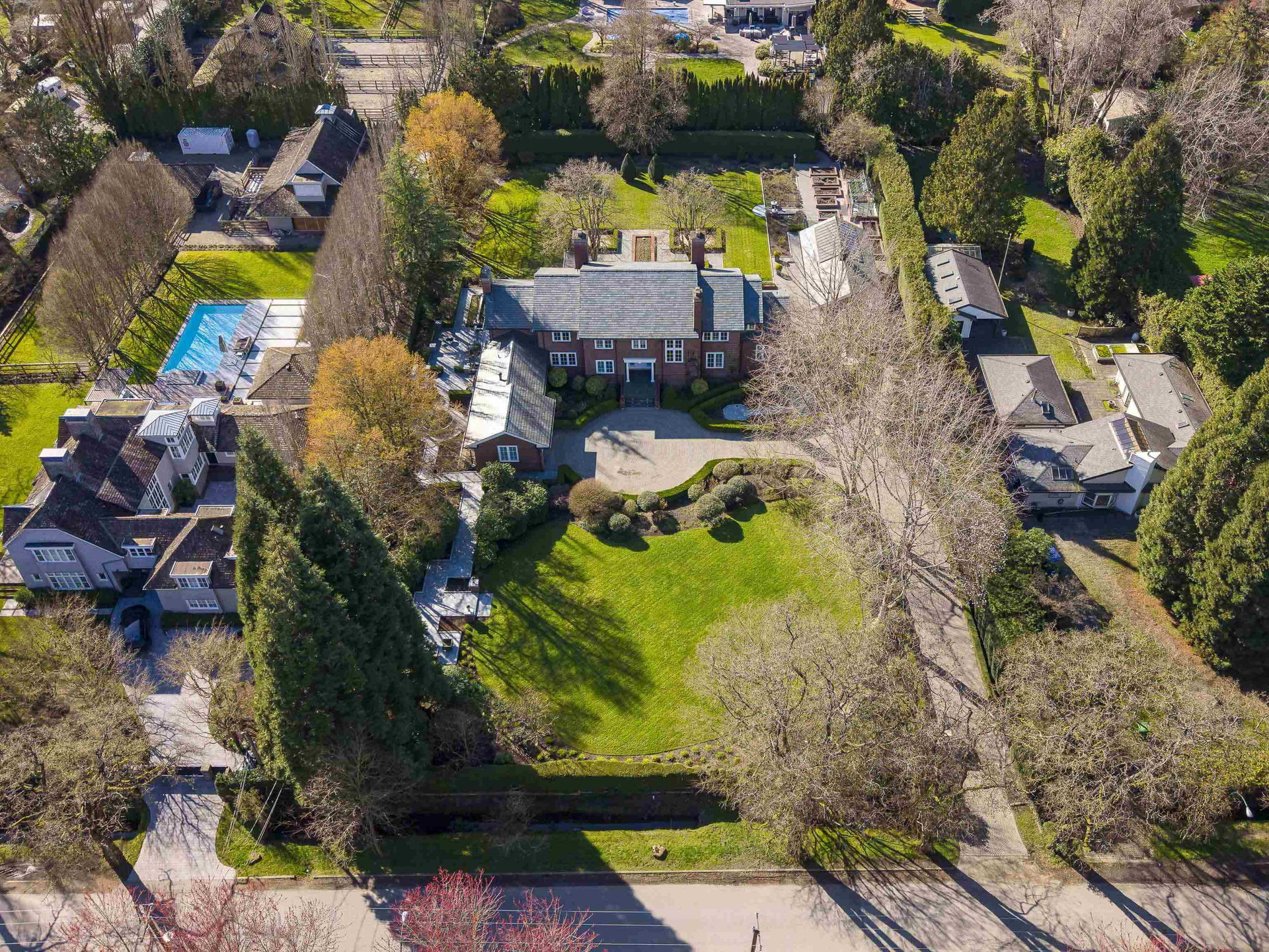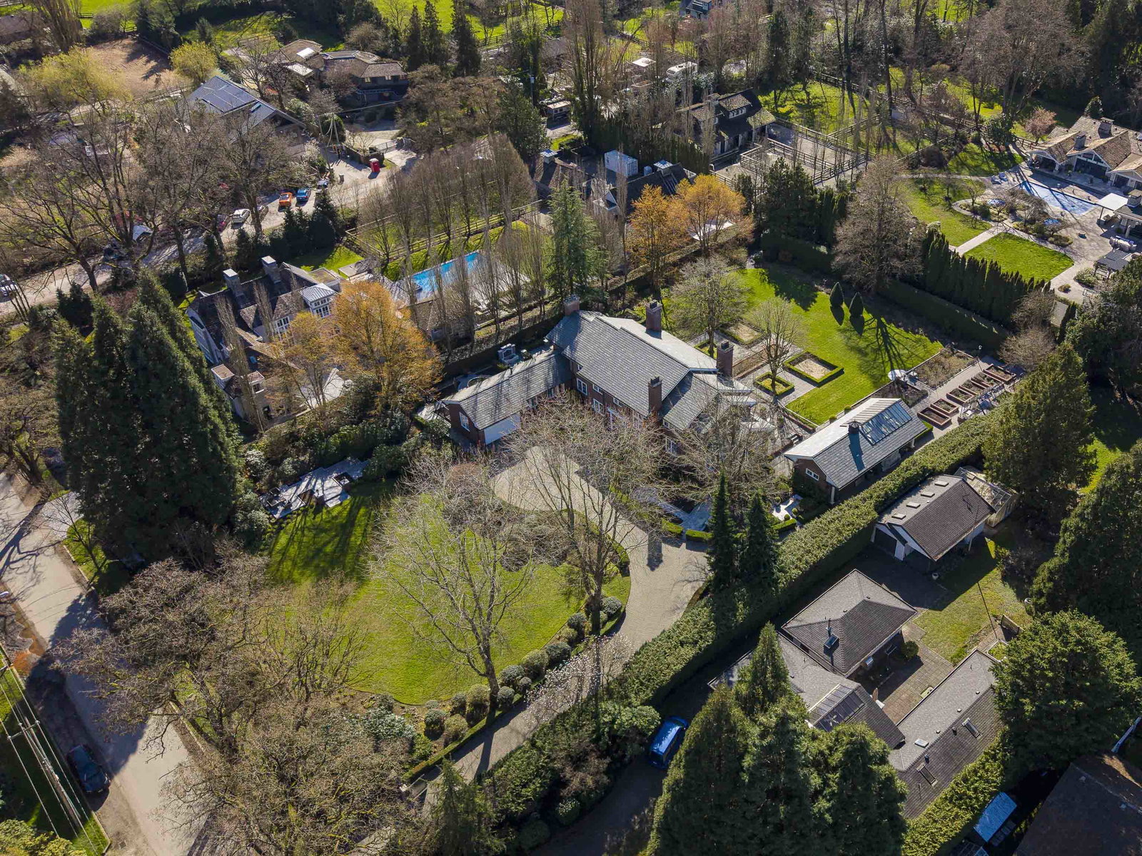 Stunning Southlands estate set on a rare 59,060 sqft lot, this sprawling English manor–inspired residence blends timeless elegance with refined living. The stately red brick home spans 5,638 sqft, featuring beautiful marble and hardwood floors, clean lines, and expansive floor-to-ceiling windows that flood the home with natural light. Grand principal rooms include a formal living and dining room, library, office, family room, and gourmet kitchen designed for both entertaining and everyday living. Upstairs offers a luxurious primary suite with walk-in closet & ensuite, reading area, and additional bedrooms and baths. A separate coach house of 773 sqft. adds flexibility. Surrounded by lush, landscaped gardens, this exceptional property evokes the charm and grace of a classic European manor.