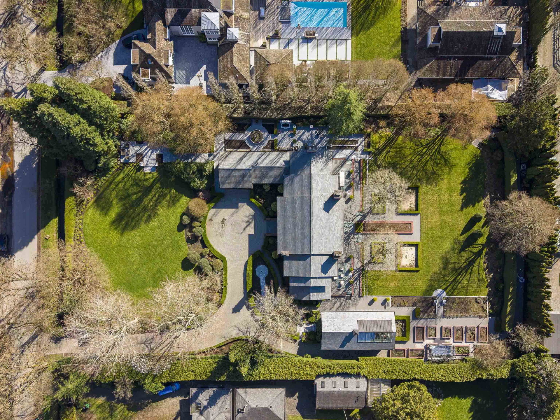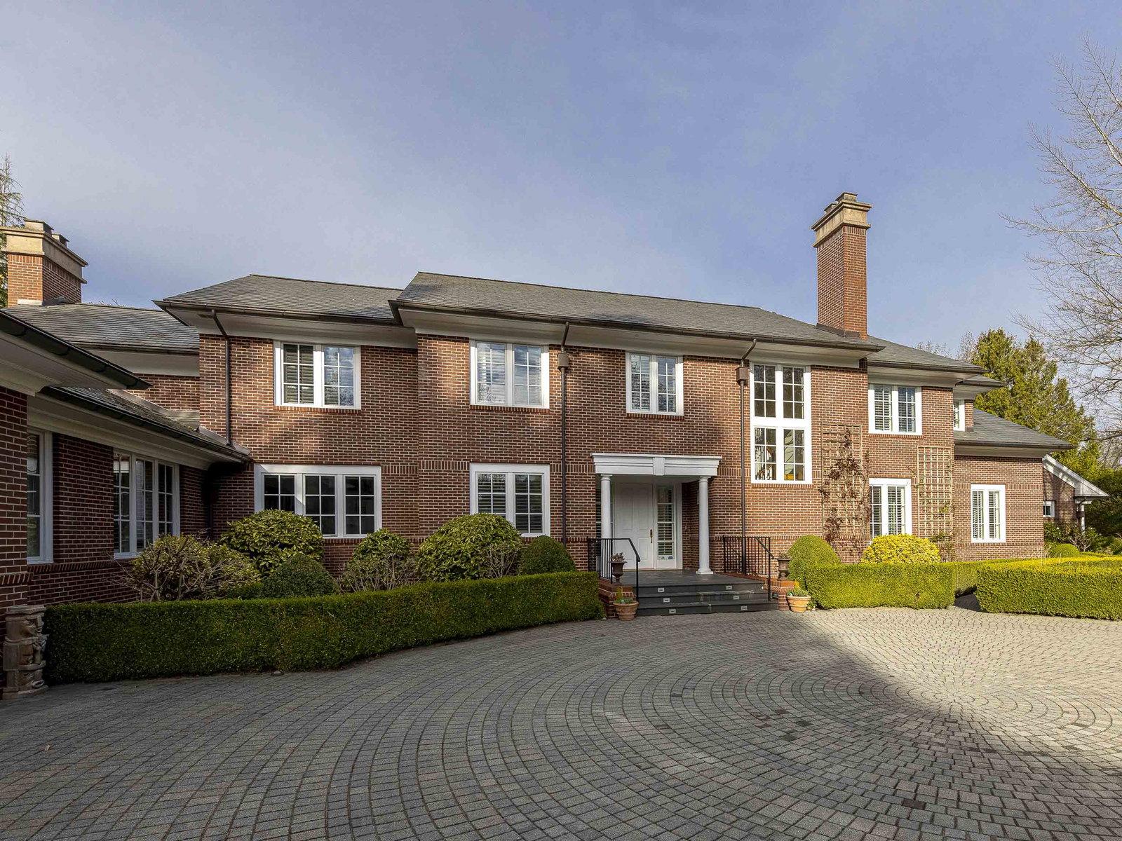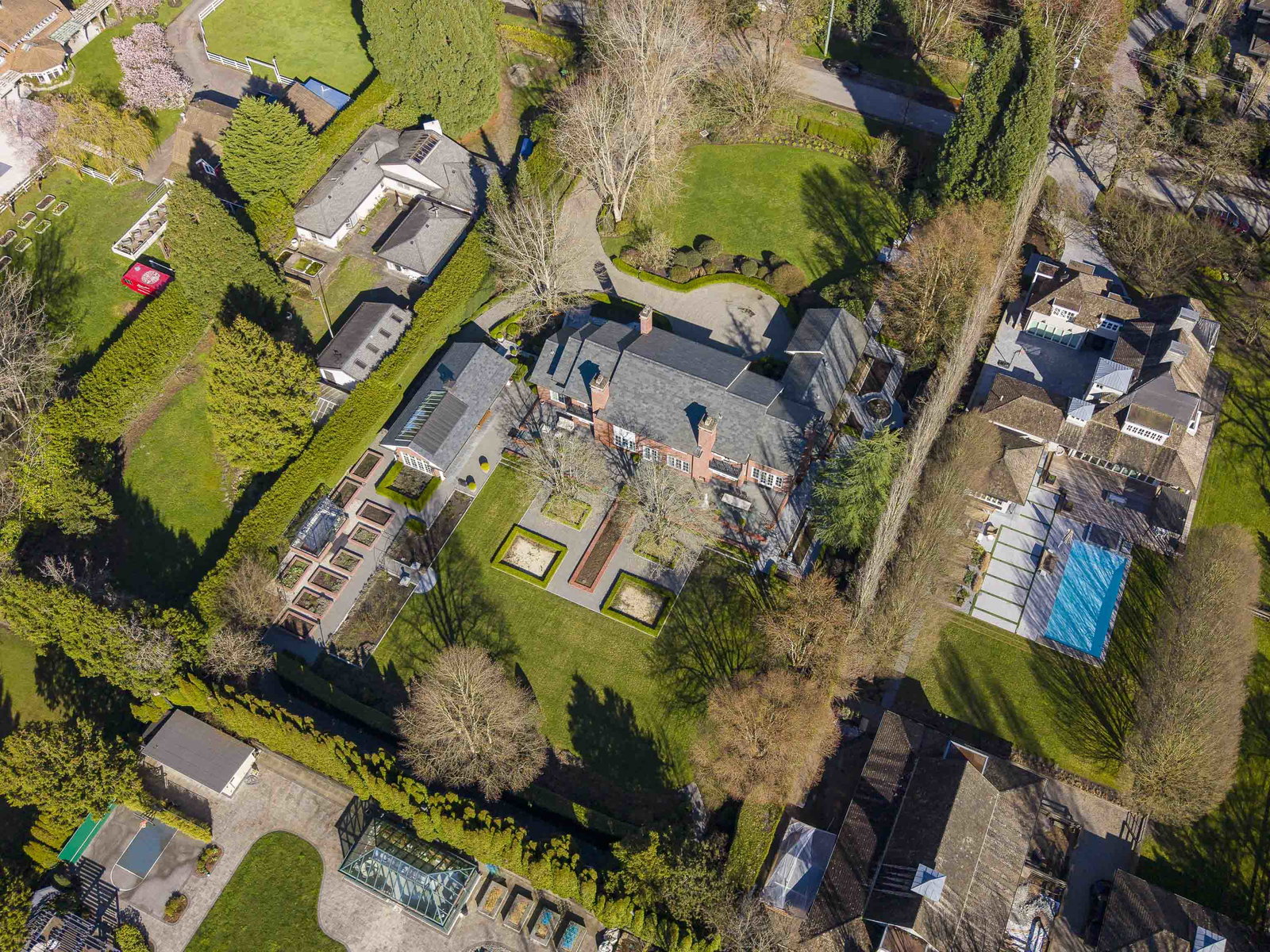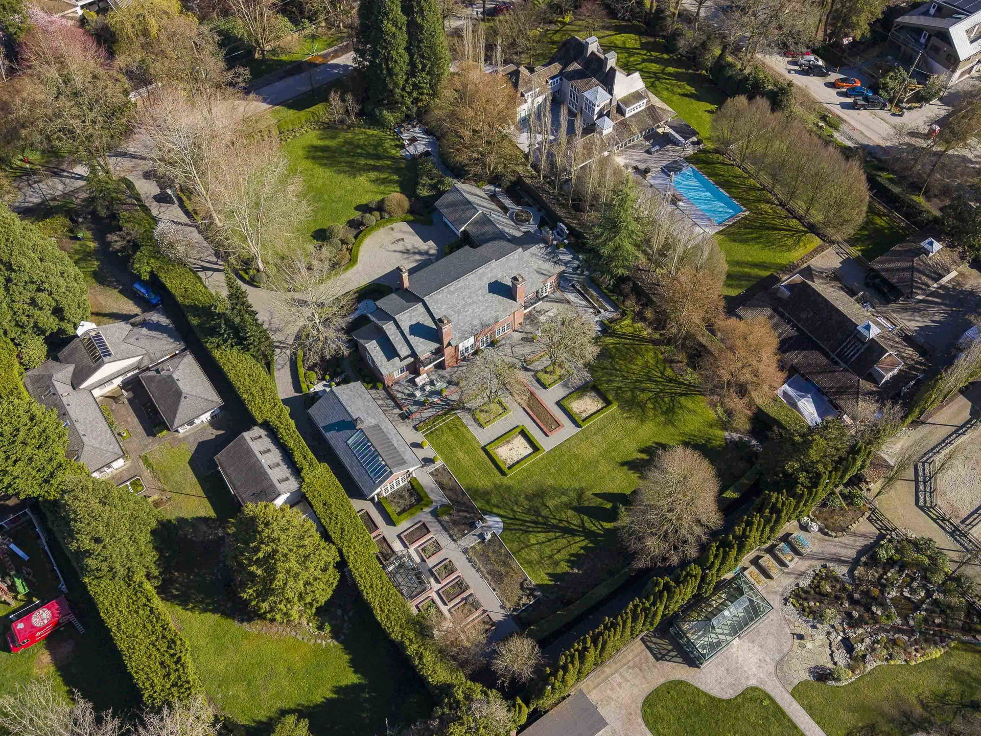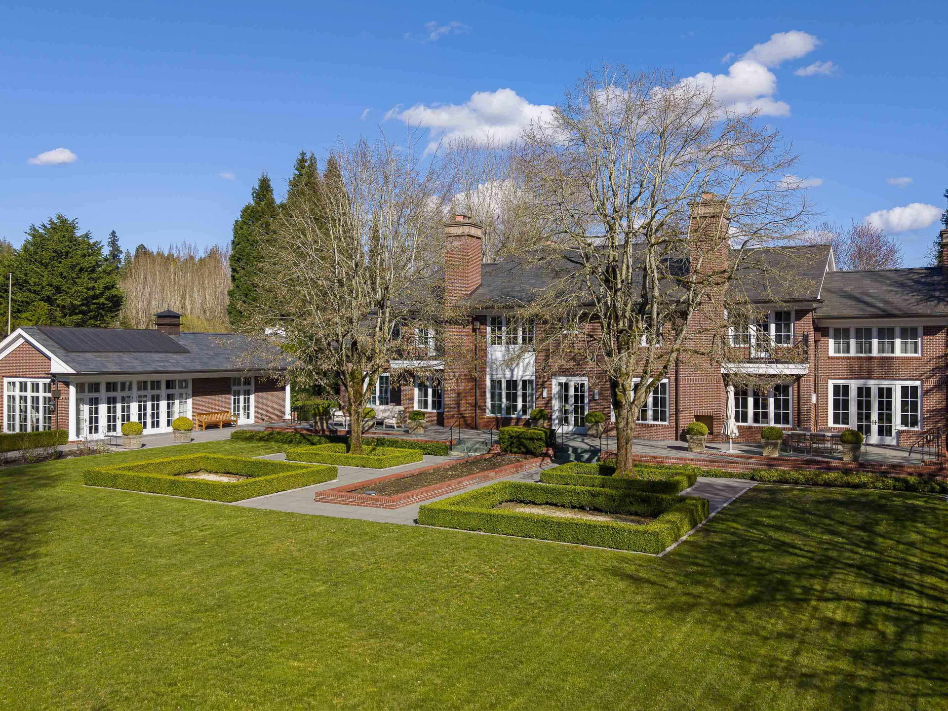 Stunning Southlands estate set on a rare 59,060 sqft lot, this sprawling English manor–inspired residence blends timeless elegance with refined living. The stately red brick home spans 5,638 sqft, featuring beautiful marble and hardwood floors, clean lines, and expansive floor-to-ceiling windows that flood the home with natural light. Grand principal rooms include a formal living and dining room, library, office, family room, and gourmet kitchen designed for both entertaining and everyday living. Upstairs offers a luxurious primary suite with walk-in closet & ensuite, reading area, and additional bedrooms and baths. A separate coach house of 773 sqft. adds flexibility. Surrounded by lush, landscaped gardens, this exceptional property evokes the charm and grace of a classic European manor.